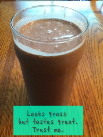 Surprisingly, it was tasty! All I did was blend a tiny bit o’ milk with the smoothie pack, banana, spinach and some yogurt, and there you have it. My whole frozen pizza for dinner is justified by this breakfast.